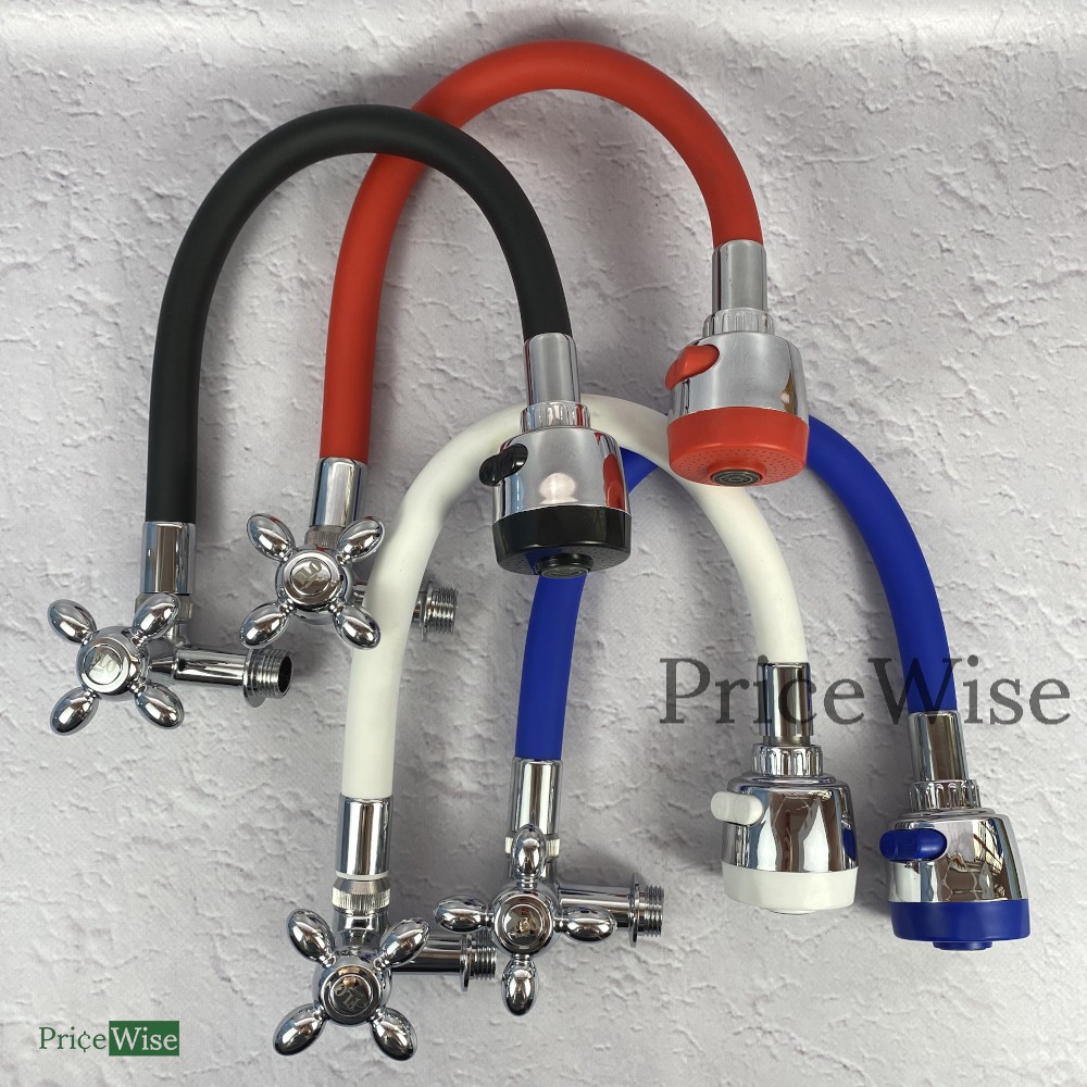 Kran Angsa Fleksibel Bak Cuci Piring dengan Karet Silikon warna tersedia 2 model kran Baling baling Engkol pilihan warna Biru Hitam Kuning Merah Orange Ungu terdapat knop yang dapat atur 2 pilihan output air besar atau kecil dilapisi karet silikon berwarna yang menarik